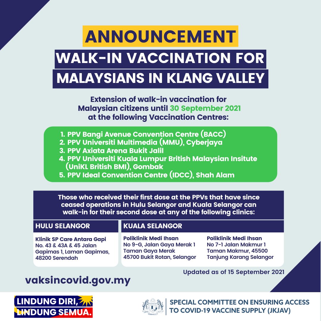 Vaksin Covid 19 On Twitter Walk In Vaccination For Malaysian Citizens In Klang Valley Will Be Continued At Five Selected Vaccination Centres Until 30 September Lindungdirilindungsemua Https T Co Mfemsae5m8